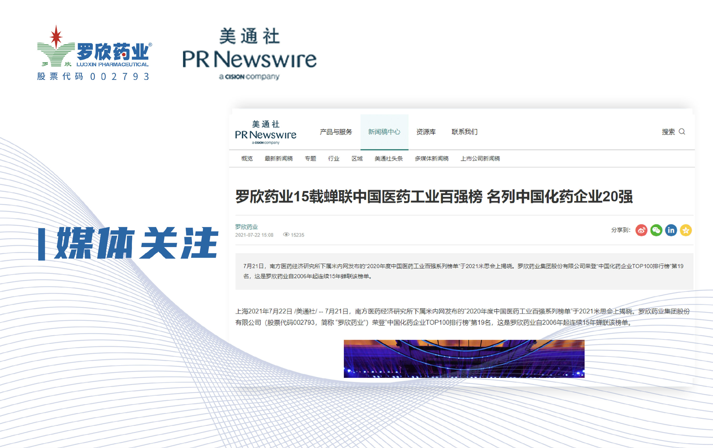 美通社报道 | 立博首页药业15载蝉联中国医药工业百强榜 名列中国化药企业20强