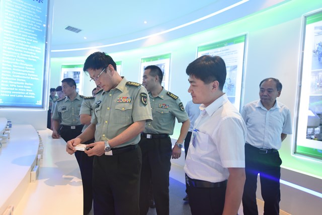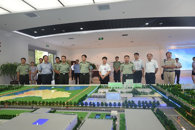 上图为山东省军区办公室主任王建阳(左四)一行参观我公司展厅时的情景