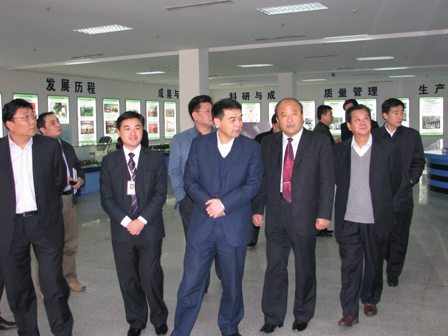 上图为山东省经贸委主任郭述禹(前排右三),临沂市委副书记、市长张少军(前排右二),临沂市人民政府党组成员、市长助理宋法亮(前排右一),罗庄区委书记王行华(前排左一)等领导参观公司展厅时的情景。