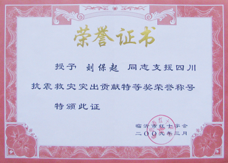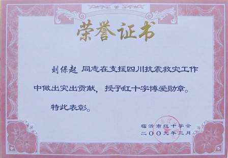 2009年3月,我公司董事长刘保起同志在支援四川抗震救灾工作中做出突出贡献被临沂市红十字会授予“支援四川抗震救灾突出贡献特等奖荣誉称号”及“红十字会博爱勋章”。