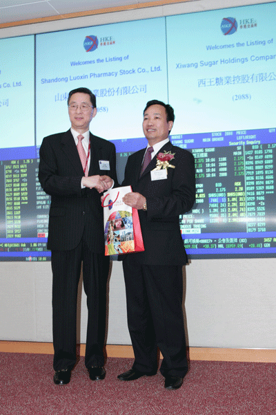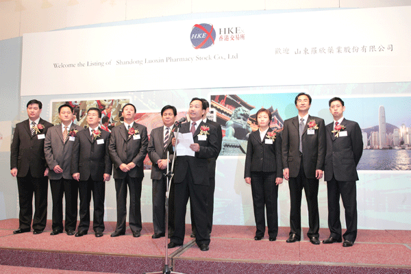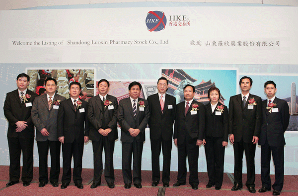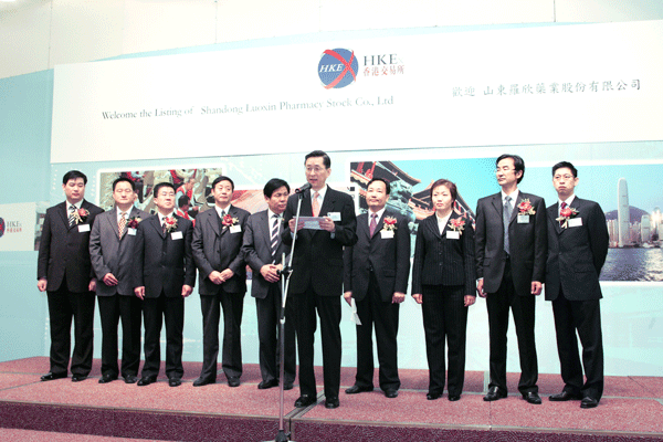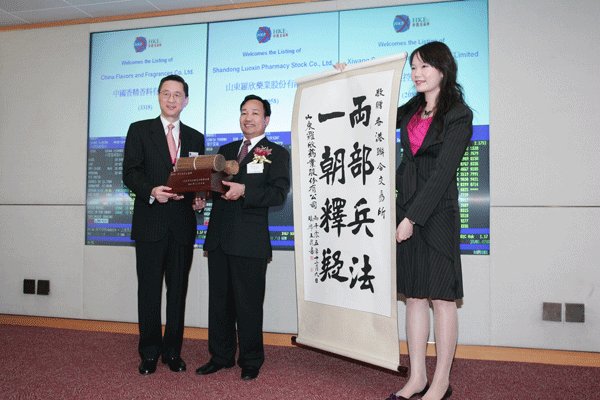 立博首页药业股票上市仪式赠送香港联交所纪念品留影1