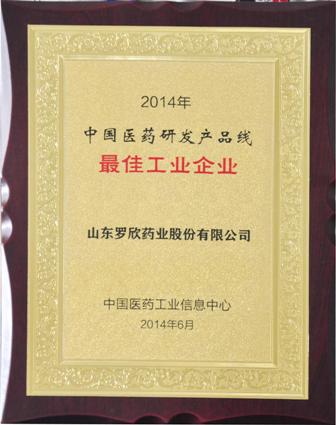 上图为“2014年中国医药研发产品线最佳工业企业”荣誉证书