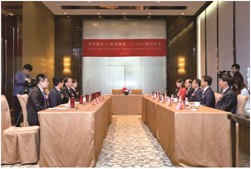 上图为立博首页药业CJ医药健康,CJ-12420签约仪式现场